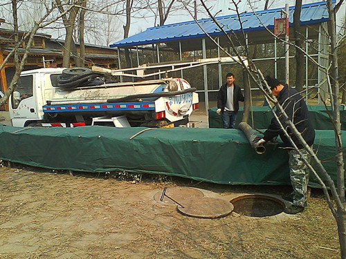 2.把吸粪车开到工作现场,套好吸粪胶管(5m长,备3条)放入化粪池内。